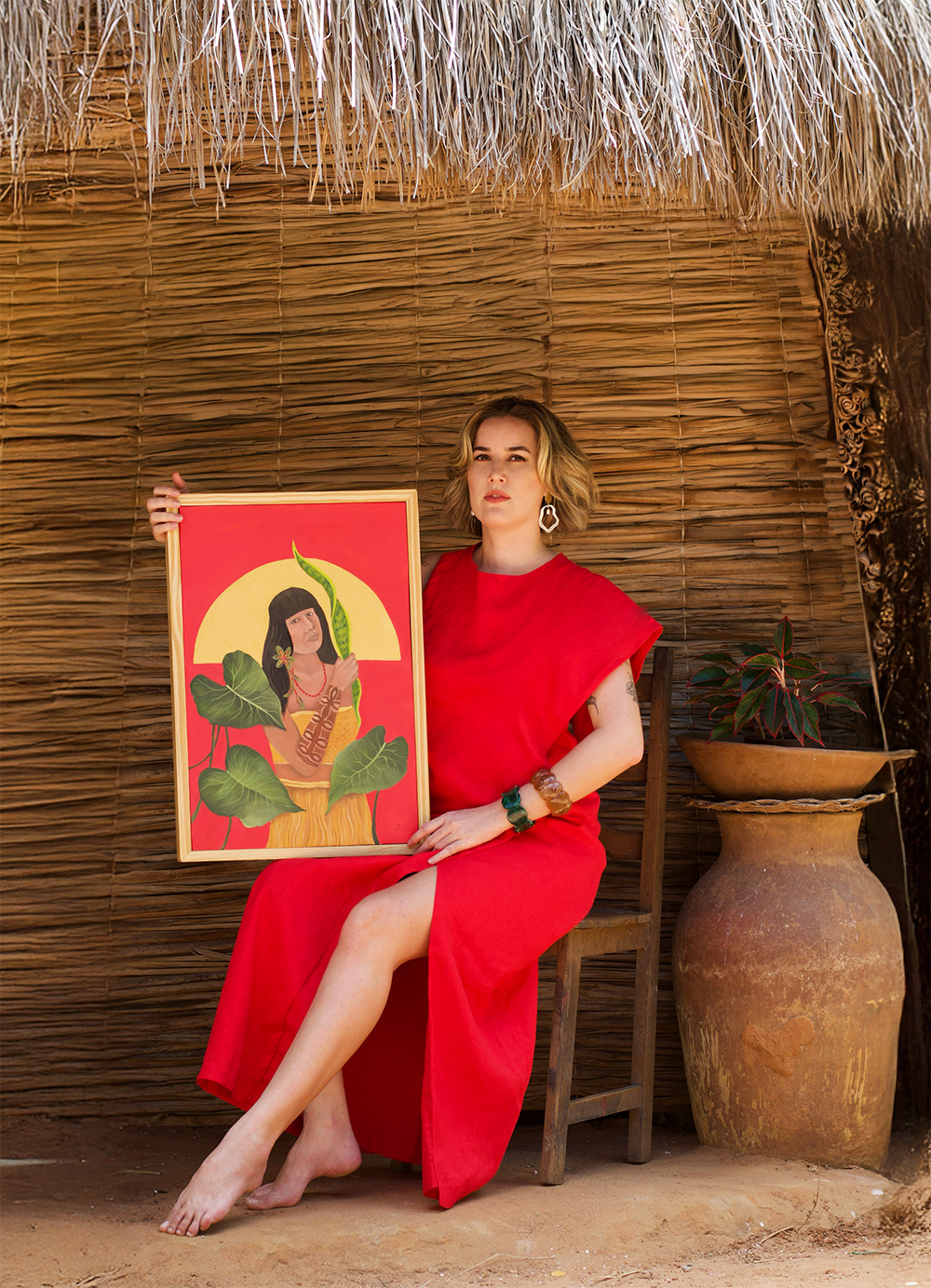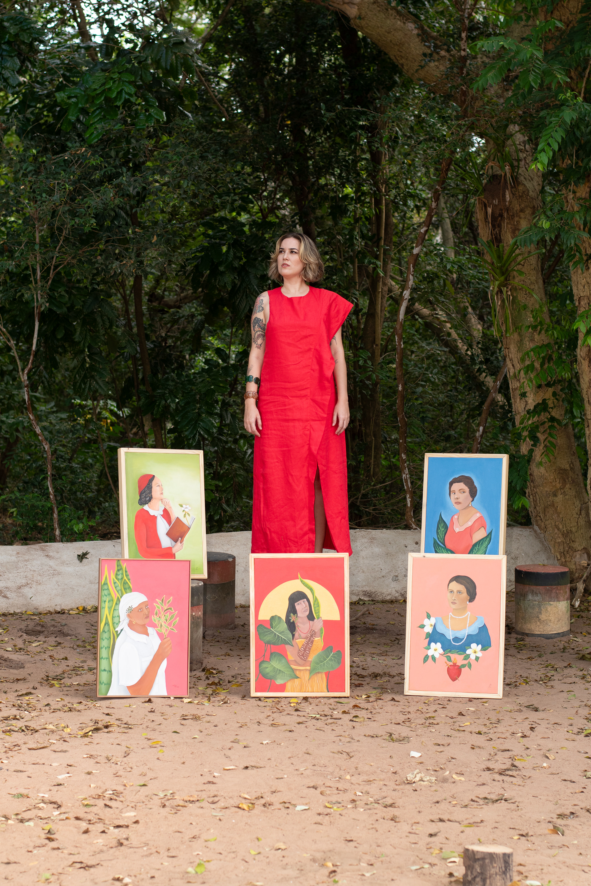 A artista desenvolve trabalhos que investigam ancestralidade e gênero feminino, produzindo retratos de mulheres e fortes referências da botânica.